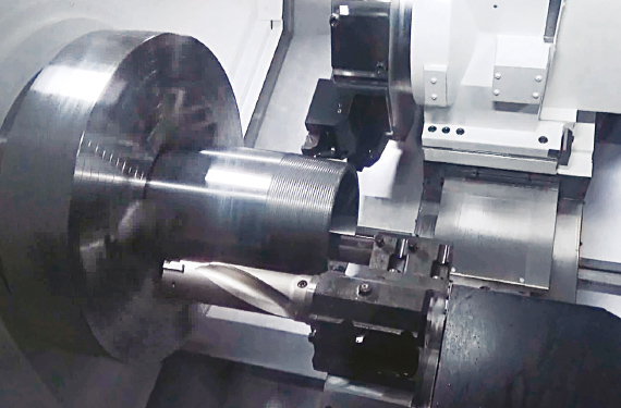 内外径同步切削 通过4轴同步控制,并使用上下刀架实现了外径螺纹加工和内径镗孔的高效率加工。 缩短了大口径管等的大型工件的加工时间。 ![]() |