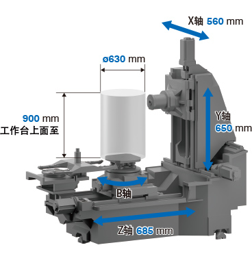 大工件尺寸 ø630mm × 900mm(升级原有机型) 注:仅限标准2面APC规格 大刀具长度 450mm(升级原有机型) |
