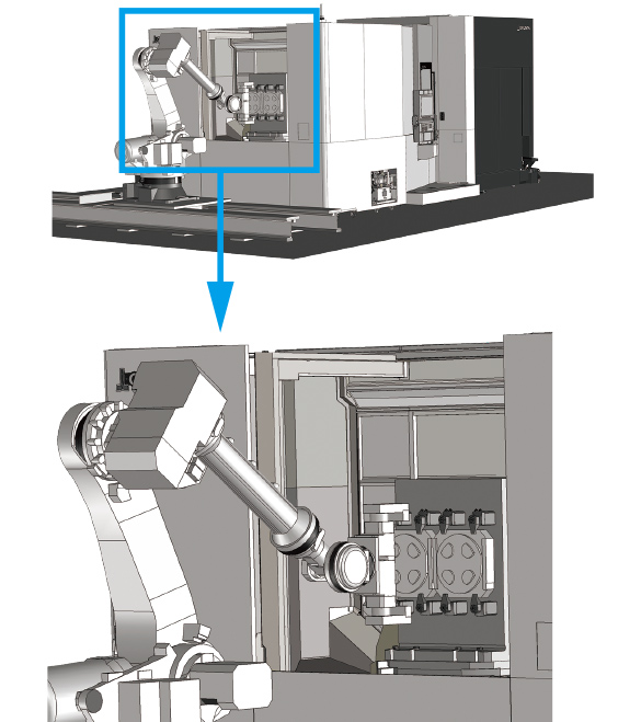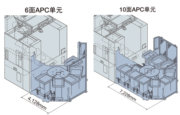 丰富的自动化阵容 柔性APC单元 如果采用多面APC,多个加工件可集中装夹,提高作业效率,可将节省的时间分配到其他作业中。 如果事先装夹好工件,可实施无人运转。 ● 将多面APC单元连接到标准2面旋转APC ● 托盘更换时间与标准相同 ● 结合车间布局、生产形态,柔性对应 |