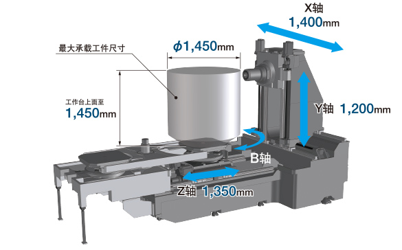 扩大加工区域 X轴移动量:1,400mm(原有机型进化) Y轴移动量:1,200mm(原有机型进化) Z轴移动量:1,350mm(原有机型进化) 工件承载重量 3,000kg(特殊规格)(原有机型进化) 大承载工件尺寸 ø1,450×1,450mm 大刀具长度 800mm(特殊规格) |