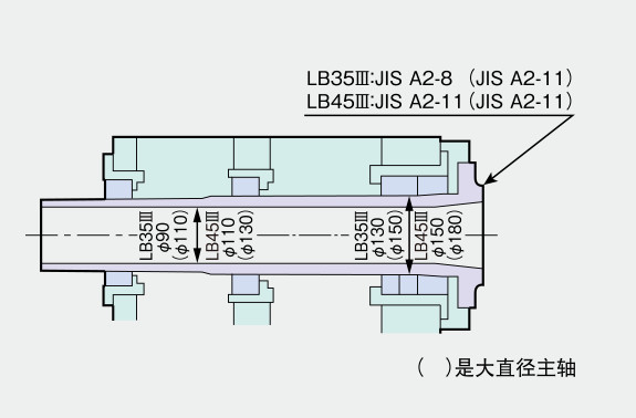 适宜于轴加工的内置型尾架 ● 标准配置采用高刚性的内置式。 套管轴直径 LB35Ⅲ:ø120mm、LB45Ⅲ:ø130mm 尾架内置 MT.No5 ![]() |