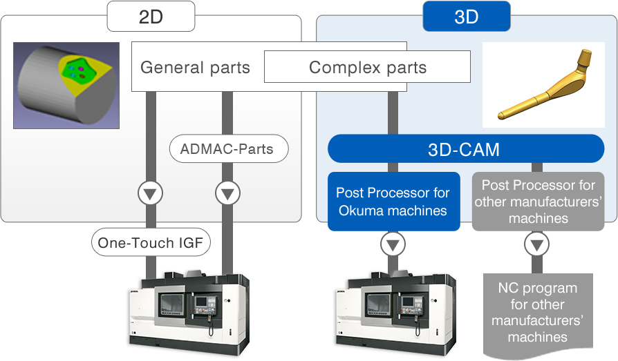 为帮助客户有效运用3D-CAM,大隈联合主要的CAM制造商,开发世界通用的、可适用于大隈机床的后处理器*1。