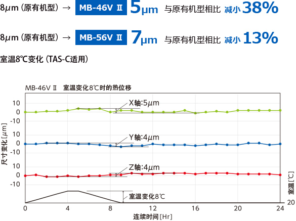 Thermo-Friendly Concept在MB-V Ⅱ系列中得到新的进化,并提高了尺寸稳定性。机床结构设计得到进一步的发展,在一般工厂环境下,MB-46V Ⅱ的经时加工尺寸变化从8μm(原有机型)改善到5μm,提高了38%(与原有机型相比),从而实现比以往更加稳定的高精度。由于无需恒温室来保持室温恒定,因此可降低工厂设备成本和功耗。