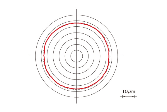 ■圆度 1.65μm(实测值) ?加工机床:MB-56VA ?外径:ø150mm ?材料:Al ?主轴转速:8,000min-1 ?进给速度:2,000mm/min ![]() |