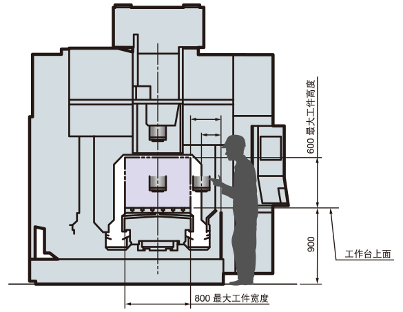对工作台/主轴的良好接近性实现良好操作性 对工作台/主轴的可近性 ● 对主轴的关联 : 220mm ● 对工作台的关联: 345mm ● 工作台高度 : 900mm ● 前面门开口宽度 : 1,620mm 大工件 ● 大工件尺寸 :长度1,600、宽度800、高度600mm ● 大承载重量 :2,500kg |