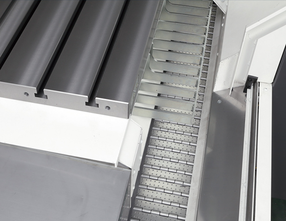 ![]() 在工作台前后设置宽敞的机内铰链式排屑器。 即使大量切屑也可顺利排出 |