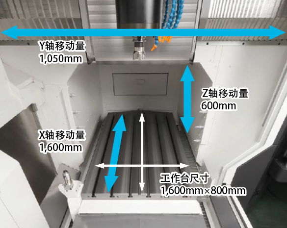 适用于中/大型零件加工的加工领域 Y轴移动量 1,050mm 对应中/大型零件加工或大型塑料模具的800mm的工作台, 1050mm的Y轴移动量 ● X轴移动量 : 1,600mm ● Y轴移动量 : 1,050mm ● 工作台尺寸 : 1,600×800mm |